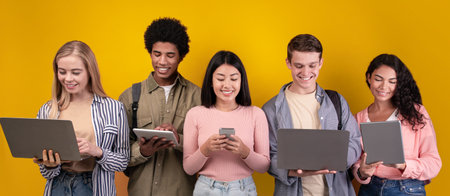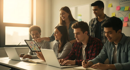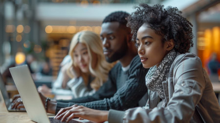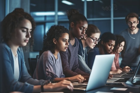 Diverse students engaged in a collaborative learning environment, showcasing focus, interaction, and creativity with laptops.