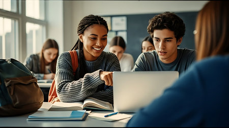 Eager Faces Illuminated: Joyful Students Engrossed in Classroom Laptop – AR 3:2