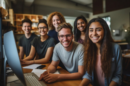 Generative AI : Multiracial diverse coworkers modern technology devices on creative office College students with laptop while sitting at table Group study for school assignment