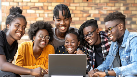 Nice young interracial students team work on laptop sitting outdoors Guy and girls use modern technologies Leisure concept : Generative AI