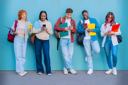 Modern young intercultural high school students work on group project sitting outdoors Guy and girls use gadgets notebooks Concept of learning : Generative AI