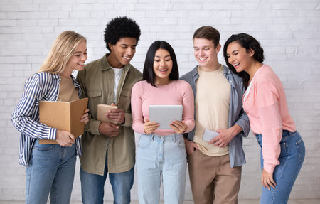 Collaborating five students gathering around tablet in school corridor, with face recognition. Collaboration, education, technology, innovation, youth, teamwork, learning