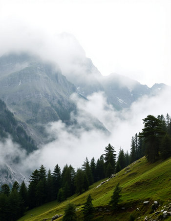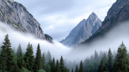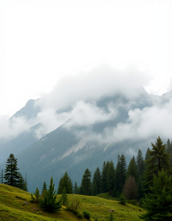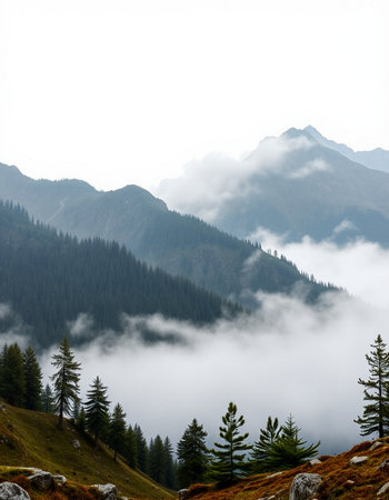 A breathtaking view of a misty mountain landscape featuring towering evergreen trees and a soft blanket of fog, evoking serenity and tranquility in nature's beauty.