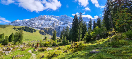 Panoramic view of the Swiss Alps in summer, Switzerland.