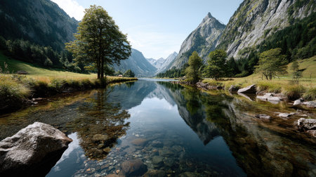 This stunning mountain landscape features a crystal-clear lake reflecting surrounding peaks and lush forests, creating a tranquil outdoor scene perfect for nature lovers.