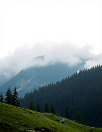 Discover a breathtaking mountain landscape featuring lush green forests surrounded by misty valleys and majestic peaks under a soft blue sky, perfect for nature enthusiasts.