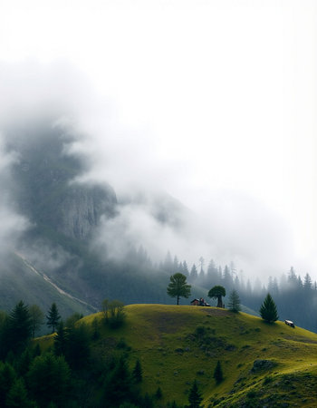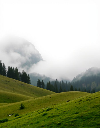 A misty morning in the mountains of Switzerland, with rolling hills and forests shrouded by fog, creating an ethereal atmosphere. The photograph captures the serene beauty of nature's tranquility. --ar 3:2 --v 6.1 Job ID: 7b93aa38-cba9-4afe-9609-19f108f7f677