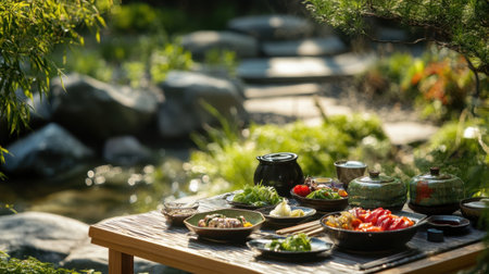 A serene outdoor Japanese garden setting featuring a beautifully arranged meal on a table. Enjoy the tranquil ambiance with nature