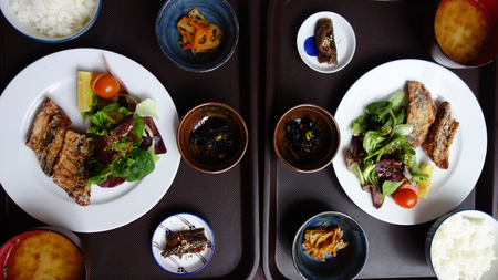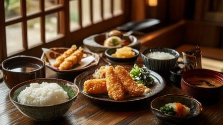 A beautifully arranged traditional Japanese meal featuring grilled fish, steaming rice, rich soup, and assorted vegetables. Enjoy the cultural dining experience.