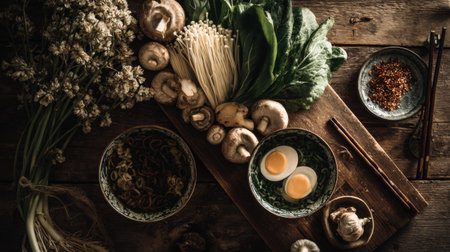 A stunning overhead view of a rustic wooden table showcasing fresh ingredients with bowls and chopsticks. Ideal for culinary inspiration and food presentation ideas.