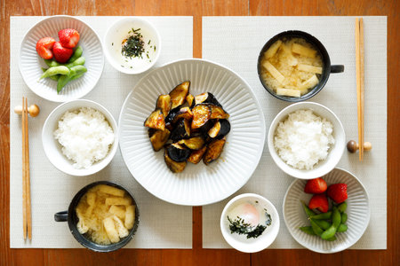 Japanese breakfast, Traditional japanese food including rice, eggplant fried with sauce, miso soup and side dishes. Japanese food set for two.