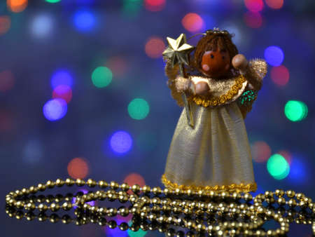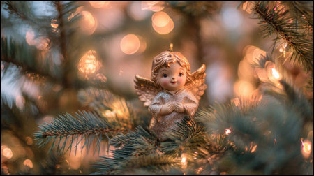 A charming vintage angel ornament nestled in a Christmas tree, surrounded by soft bokeh lights, evoking warmth and holiday spirit perfect for festive decorations.