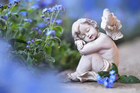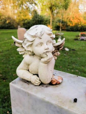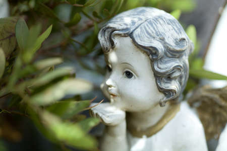 Statue of a peaceful angel child in the garden close-up. Stone cherub.