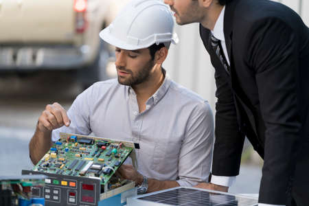 Employees are checking the operation of the solar panel. Engineer installing solar panels on a roof house for alternative energy photovoltaic safe energy.