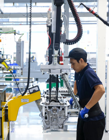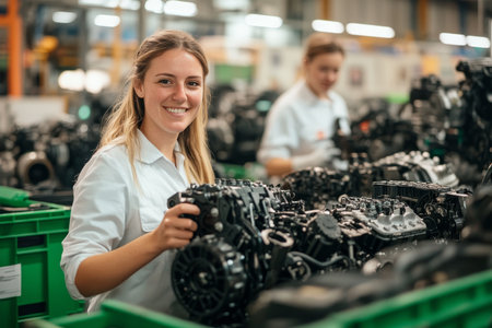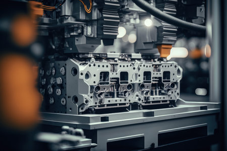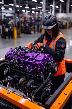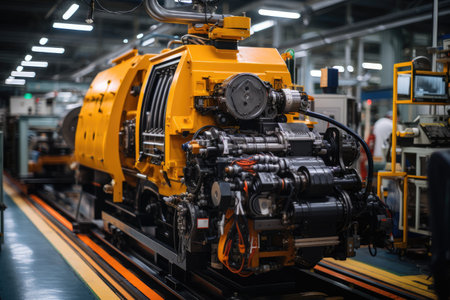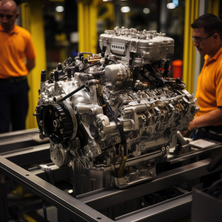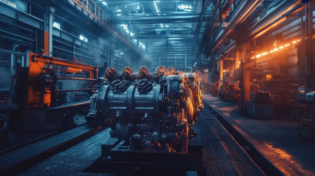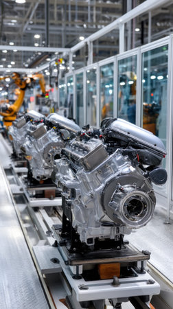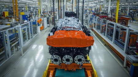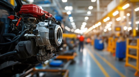 A captivating glimpse into a modern industrial manufacturing facility, highlighting the intricate process of engine assembly and the use of advanced machinery in production tasks.