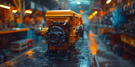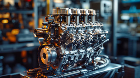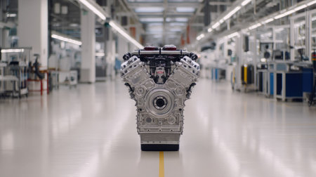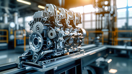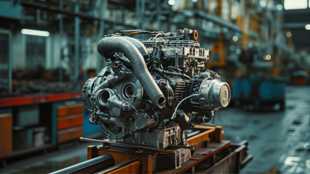 A stunning view of a high-tech engine showcased in an industrial factory setting, featuring dramatic lighting and subtle smoke effects, ideal for automotive and manufacturing themes.