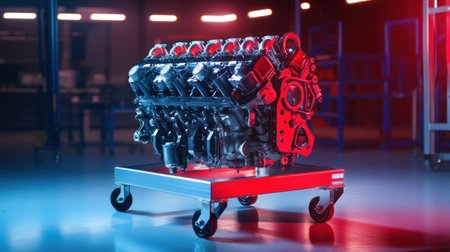 An eye-catching automotive engine is showcased under vibrant red and blue lighting, set within a mechanical workshop environment highlighting engineering excellence.