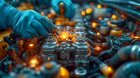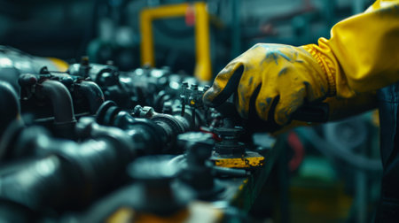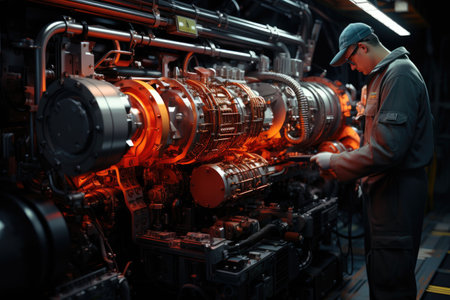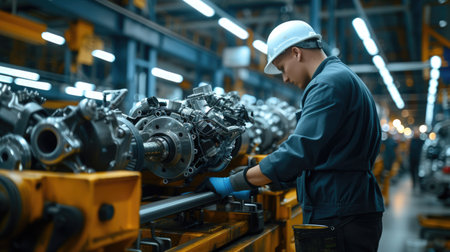 A man is working on an engine in an automotive factory, specializing in the production of motor vehicles and auto parts. AIG41