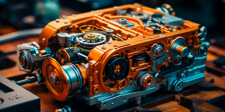 Detailed close up of innovative car engine prototype in high definition cutaway view