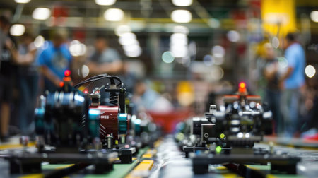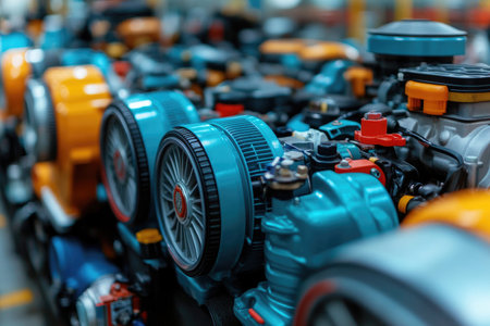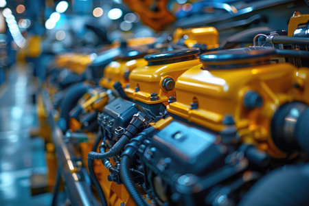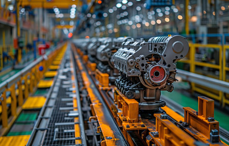 A vibrant industrial assembly line showcasing engine production with advanced robotic automation in a modern manufacturing facility.