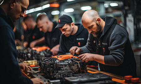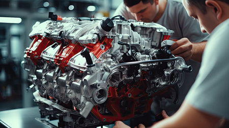 close-up of sports car engine assembly line, created with generative ai