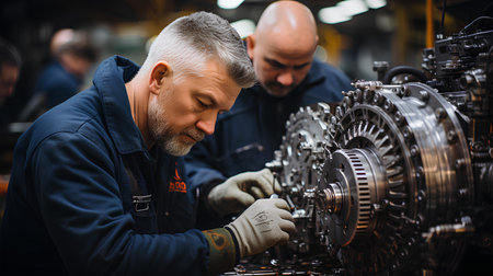Two workers, a team, are focusing on repairing an engine in a busy factory setting.