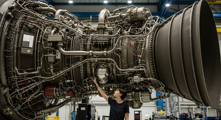 A female aerospace engineer stands before a massive and incredibly complex rocket engine, carefully inspecting its intricate network of pipes, wiring, and components. The scale of the engine highlights the power and advanced technology required for space travel. This image celebrates women in STEM, engineering, and space exploration.
