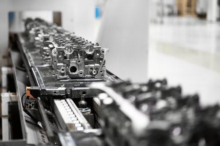 Modern automobile production line with car engine parts being moved by a conveyor belt in a factory