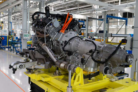 Automotive production line. Car engine assembly line. Industrial background.