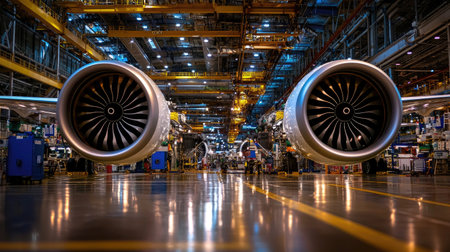 A stunning perspective of aircraft engines in a bustling manufacturing facility captures the essence of modern aviation technology and engineering processes.