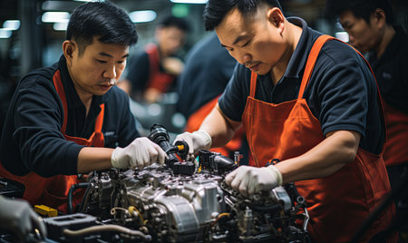 In a vibrant factory, skilled workers in red shirts expertly assemble engines, focused on their tasks with precision. The atmosphere buzzes with energy and teamwork, showcasing craftsmanship.