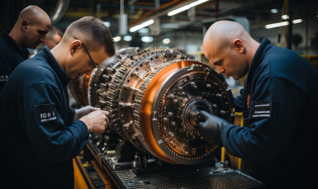 A team of engineers and mechanics inspects a newly installed industrial motor in a factory.