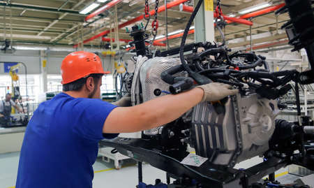 Focused mechanical engineer assembling car engine parts on a production line in a modern car factory