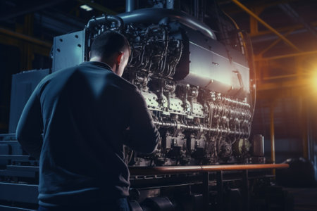 An AI illustration of A Caucasian man wearing a bright yellow shirt is standing alone beside a large engine in an industrial warehouse
