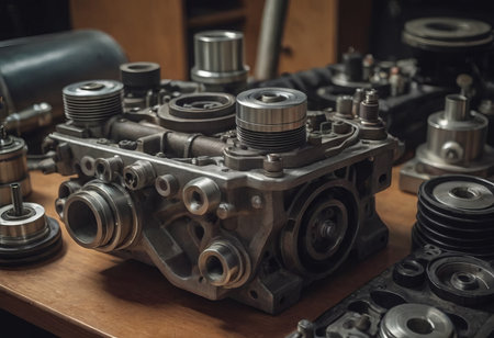 An array of mechanical parts meticulously laid out during an engine overhaul, showcasing precision and expertise in mechanical engineering.