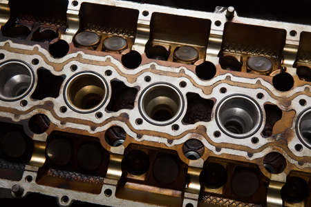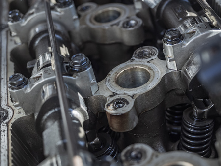 Open engine block exposing the interior parts and springs, service and maintenance concept in garage