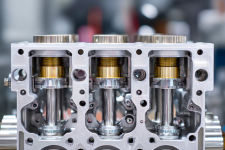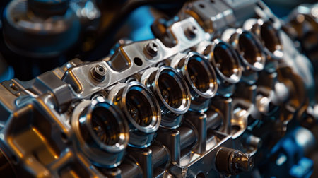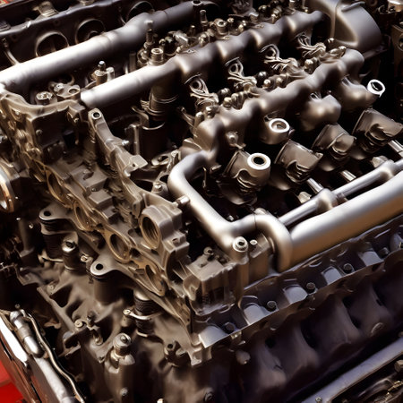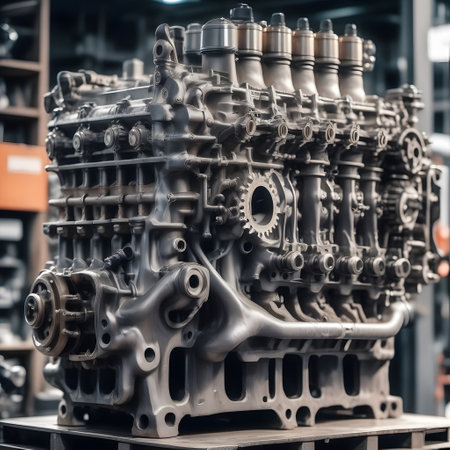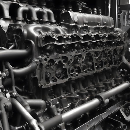 Close-up view of an industrial engine showcasing intricate machine components. The image highlights the design and engineering of mechanical parts in a modern factory setting.