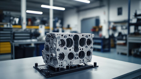 An engine block displayed in a clean workshop, showcasing its structure and shiny surfaces.