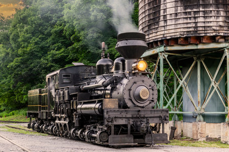 An Antique Shay Steam Locomotive, Steamed up, Blowing Smoke, Sitting by a Water Tower, Getting Ready for Work