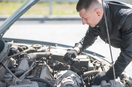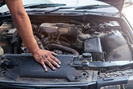 Repairman Working with dirty hands and tools fixing car engine at service shop.