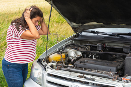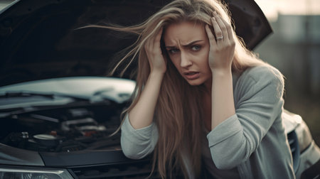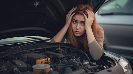 An astonished woman, her expression filled with disbelief, examines the exposed engine of her car, clearly shocked by the car breakdown