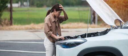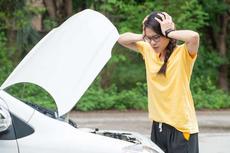 Young stressed woman having trouble with her car breakdown on the road and she waiting someone can help her. Conceptual of car accident on the road.