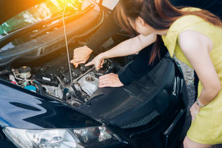 The girl is looking for a breakdown on the hood of the car, checks the oil. close-up.