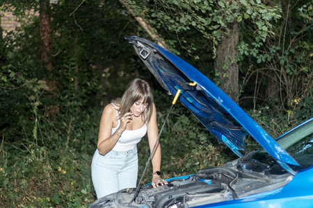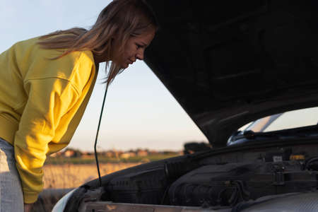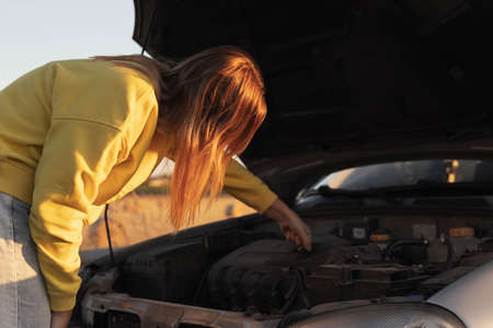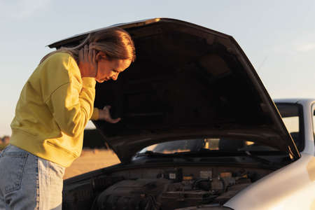 a girl with blond hair of European appearance in casual clothes, stands with an open hood of a car and looks at what has broken. A car breakdown on the road. there is a place for an inscription