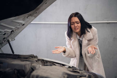 Young woman standing near a parked broken down car having trouble with her vehicle. Woman driver waiting for help besides auto malfunction