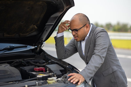 Young asian business has broken down car. He open hood and check the engine. He feeling upset and stressed. Car broken on the side of the road
