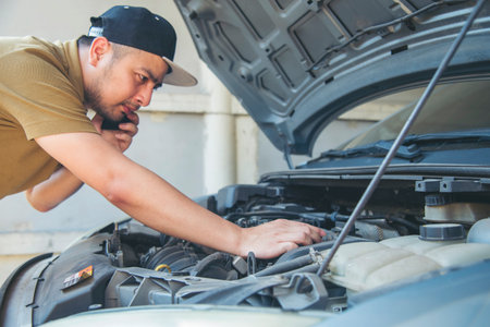 Men fix car call for help use phone calling insurance agent help fixing car problem breakdown. Man calling mechanic car service technician support fix repair driving. Vehicle emergency problem