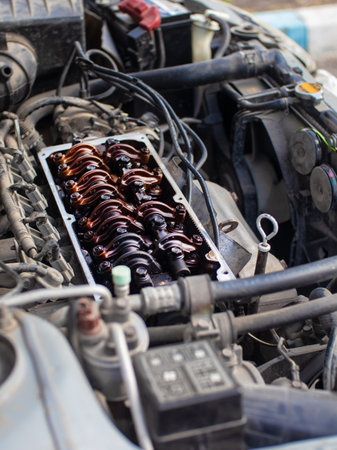 Old used diesel engine with rusty and dirty auto parts, water infiltration and bad car maintenance.