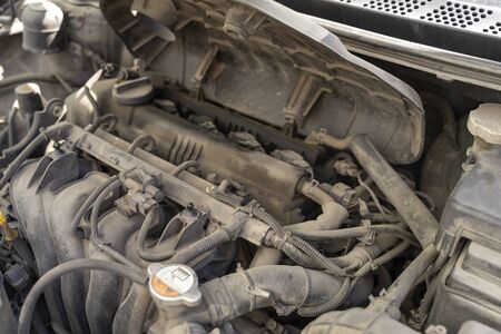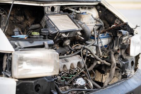 Open hood of the car. View of the engine and vehicle parts. Diagnostics and repair of an old car.