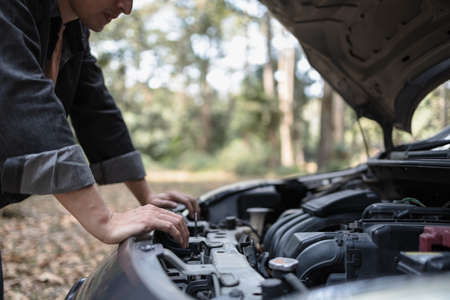 Man' hand open hood of a broken car on the road in the forest. Car breakdown concept.